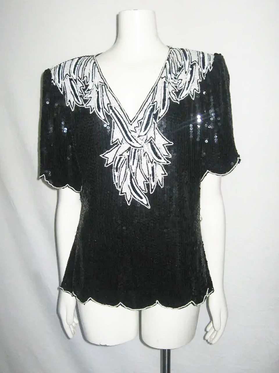 Loading... Please wait...VTG Stenay Black White Pearl Beads Sequins Embellished Silk V-neck Scallop Edge Short Elbow Sleeve Shoulder Pads Slouchy Lined Tunic Blouse Top w/ Center Back Zip & Hook & Eye Closure